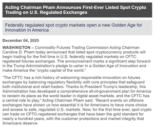 JUST IN: 🇺🇸 La CFTC annuncia che le criptovalute spot sono ora autorizzate a essere scambiate sulle borse statunitensi registrate presso la CFTC.