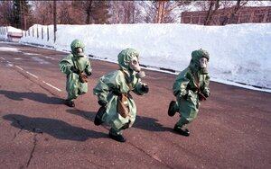 Bambini che partecipano a un'esercitazione di attacco biologico a Kineshma, Russia.