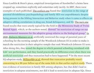 Uno degli argomenti più comuni contro gli studi sull'adozione è che c'è una restrizione di gamma negli ambienti familiari Quando questa critica è stata sollevata per la prima volta, si è dimostrato che implicava conseguenze assurde che non erano vere. Quando è stata testata, si è scoperto che era una critica vuota.