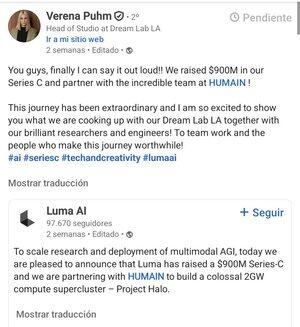Congratulazioni a @verenapuhm per il gigantesco finanziamento di $900M di Luma. Sarà davvero interessante vedere questo attore confrontarsi con giganti come Google e OpenAI.