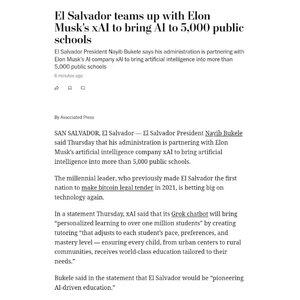 WAPO: El Salvador collabora con xAI di Elon Musk per portare l'IA in 5.000 scuole pubbliche