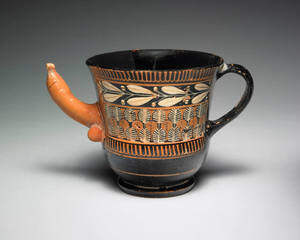 赤字1号は、男根の形をした噴口を持つカンタロスを扱っていた。文化:ギリシャ、アッティカ。年代:紀元前470年頃。中:赤図装飾と白を加えたテラコッタ。寸法:H. 10.8 cm;水長16.8cm。コレクション:マイケル・C・カルロス博物館、エモリー大学、アトランタ。 カンタロスは、ワインの神ディオニュソスの古典的なワインカップです。通常は二つの高い取っ手を持っているので、ここでの陶芸家は馴染みのある形を取り、一つの取っ手を男性の解剖学的形状にいたずらっぽく置き換えている。