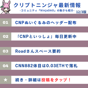 Crypto Ninja 最新情報 12/3 エディション ⏤⏤⏤⏤⏤⏤⏤⏤⏤⏤⏤⏤⏤⏤⏤⏤⏤ (1) CNPプラッシュヘッダーの分布 (2)「CNPと共に」は毎日更新されています (3) 道路の空間概要 (4) CNN882が0.03 ETHの入札に落札しました 以下は様々な情報源です 🔽 いつも💖🔁ありがとうございます!