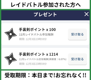 🌟 「レイドバトル」に参加した方へ。 ⚡️ 手裏剣ポイントは移されます。 📝 領収書の締め切り:「今日まで!」 まだなら、今すぐ手に入れてください! 忘れないで ください~ 🥰🍀