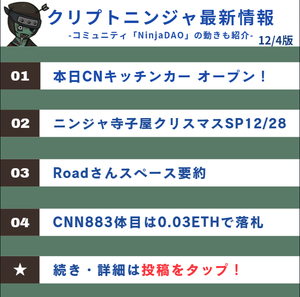 クリプトニンジャ最新12/4エディション ⏤⏤⏤⏤⏤⏤⏤⏤⏤⏤⏤⏤⏤⏤⏤⏤⏤ (1)CNキッチンカーが本日オープン! (2) 忍者寺古屋クリスマス SP 12/28 (3) 道路の空間概要 (4) CNN883が0.03 ETHの入札に勝ちました 以下は様々な情報源です 🔽 いつも💖🔁ありがとうございます!