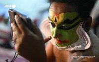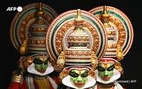 ヒンドゥー教の叙事詩マハーバーラタの登場人物に扮したカタカリのアーティストが、インドのバンガロールにある国立近代美術館でパフォーマンスを行っています