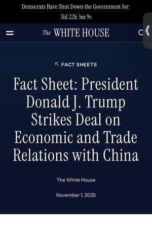 公開されたばかり ->ファクトシート:ドナルド・J・トランプ大統領、中国との経済貿易関係に関する合意を結ぶ。 この歴史的な合意には、以下のことに対する中国の約束が含まれています。 •フェンタニルの製造に使用される前駆体の米国への流入を止める。 •希土類元素およびその他の重要鉱物に対する中国の現在および提案されている輸出規制を効果的に撤廃する。 •米国の半導体メーカーやその他の米国の大手企業に対する中国の報復を終わらせる。 •中国の市場を米国産大豆やその他の農産物輸出に開放する。