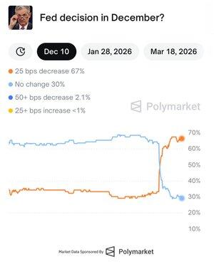 最新情報:🇺🇸 12月の25ベーシスポイント利下げの可能性は67%に急上昇したと、ポリマーケットは発表しています。 強気!🚀
