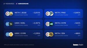 エアドローム・スリップストリームLPリワード ✈️ • $WETH - $JESSE:~3,013% • $USDC - $EDEL:~2,357% • $USDC - $CYPR:~1,378% • $WETH - $PING:~1,045% • $WETH - $HYPE:~543% • $WETH - $ZEN:~489% @baseの新しい初日です。LPの現状 👇