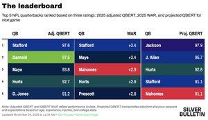 アレン、ジャクソン、マホームズがいずれも苦しい時期にあり、クォーターバックにとっては少し変わった年でした。これにより、WARではスタッフォードとメイがリードし、偶然ではなく、ベガスからは彼女たちが唯一の#実質的なMVP候補と見なされています。