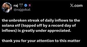 最新情報:共同創業者の@rajgokal@solana、Solana ETFへの1日連続の流入記録は「非常に過小評価されている」と述べています。 (ソラナETFは20日連続で資金流入があり、昨日は5,800万ドルが追加されました)