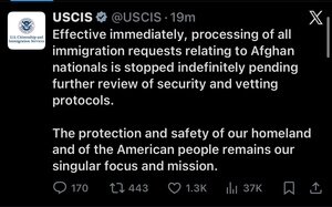 USCIS: 「即時発効で、アフガン国民に関するすべての移民申請の処理は、安全保障および審査手続きのさらなる見直しが行われるまで無期限停止されます。 我が国とアメリカ国民の保護と安全は、我々の唯一の焦点であり使命です。」