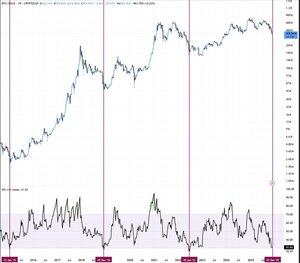 BTC/ゴールドの週間RSIは現在、売られ過ぎた水準にあります。 過去にはこれがサイクルの底を刻み、大規模なラリーを生み出しました。 歴史はまた繰り返されるのでしょうか?