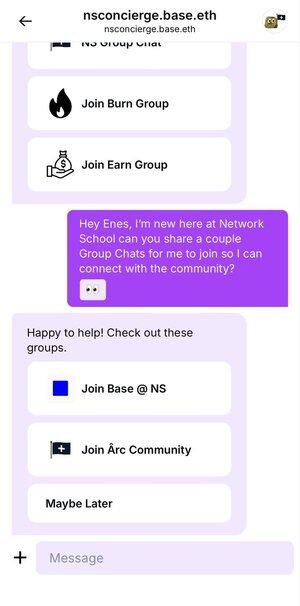 NSコミュニティとつながりたいですか?聞いてみてください。ネットワークスクールのエージェントであるエネスが、参加すべきグループを提案するだけでなく、グループチャットの活動が起きている場所に直接@baseapp教えてくれます。