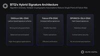 BTQは複数の量子耐性シグネチャ方式をサポートしており、どれかがクラックされてもネットワークが侵害されないようにしています。トランザクションは複数の異なるアルゴリズムによる検証を同時に必要とすることもあります。