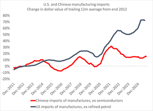 関連するグラフですが、中国のチップ輸出を純分にすると、製造業の名目輸入は過去10年間でほぼ横ばい(5ポイント増加)です。 中国の輸出はその期間中に明らかに爆発的に増加しました。