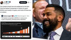 新情報:SOLANA共同創業者のアレッジ@rajgokalは「市場は、史上最速で1億ドルに到達した企業の多くが暗号通貨であり、その多くがSOLANA上にあるという事実にまだ目覚めていない」と述べています。