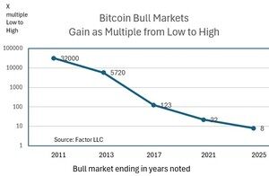 Historien om Bitcoins bullmarkedssykluser har vært en historie med eksponentiell nedgang. Enten du er enig eller ikke, må du bare leve med det. Skulle den nåværende nedgangen fortsette til 50 000 dollar, bør neste bullmarkedssyklus fortsette til 200 000 til 250 000 dollar