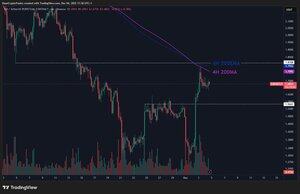 Nå konsoliderer jeg mot motstand med 4H 200MA/EMA rett over.