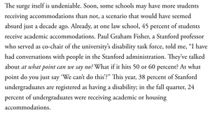 Etter hvert som studenter og deres foreldre har anerkjent fordelene ved å kreve uføretrygd – utvidet tid på prøver, boligtilrettelegging osv. – har andelen funksjonshemming ved høyskoler, og spesielt ved eliteuniversiteter, eksplodert.