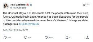 Utrolig. Tulsi Gabbard hevdet 31. oktober 2025 at Trump satte en stopper for Washingtons endeløse syklus av «regimeskifte» og «nasjonsbygging». I mellomtiden pågår en fullskala regimeskifteoperasjon i Venezuela, og Trump har eksplisitt innført USA-ledet «nasjonsbygging» i Gaza