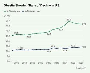 Den amerikanske fedmeraten er på vei ned, ifølge Gallup-undersøkelser. Etter å ha nådd en topp på 40 % i 2022, er den nå 37 %.