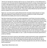 Etter 9,5 måneder i israelsk militær fengsling har den palestinsk-amerikanske 16 år gamle Mohammed Zaher Ibrahim blitt løslatt fra Ofer-fengselet og gjenforent med familien sin. Han får nå medisinsk behandling. Familien hans tilskriver en vedvarende grasrotpresskampanje — og oppfordrer til fortsatt arbeid for de hundrevis av palestinske barna som fortsatt sitter i israelske militærfengsler. Familien ber om privatliv.