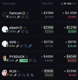 Topp Pumpfun-mynter for den siste 1 timen basert på volum: $Fartcoin $Pippin $Gvg $Pysduck $Plol