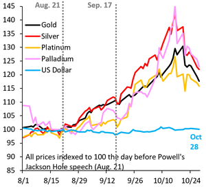 • Gull, sølv, platina og palladium nådde alle toppen i midten av oktober etter et rally på 30 % siden slutten av august.