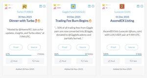 Tre kommende #memecoin arrangementer 🔥 $TURBO (@turbotoadtoken) 30. nov 2025 Middag med Turbo 👉 $GIGGLE (@gigglefundbsc) 01. des 2025 Byttegebyrets brenning begynner 👉 $LUX (@luxx_coin) 01. des 2025 AscendEX-oppføring 👉 Flere memecoin-arrangementer 👉