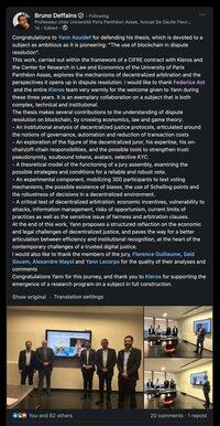 Gratulerer til Dr. Yann Aouidef (@AouidefY), som forsvarte sin doktorgrad "The use of blockchain in dispute resolution" – en CIFRE-avhandling mellom Paris-Panthéon-Assas (Centre de Recherches en Droit et Économie) og Kleros, som dekker protokolldesign, jurymedlemmers rolle (pseudonymitet, SBT-er, selektiv KYC) og eksperimentelle bevis fra 300+ deltakere om Schelling-poengstemmegivning og insentivrobusthet.