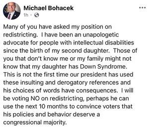 Indiana-republikanske senator Mike Bohacek, som har en datter med Downs syndrom, sier han vil stemme nei til omfordeling av valgkretser etter Trumps «retarderte» skjellsord mot guvernør Walz.