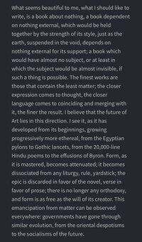 Å skrive er å tenke, og vakker skriving handler i bunn og grunn om vakre tanker. Store tanker trenger bare den enkleste prosaen for å formidles. Omvendt kan ingen mengde overfladisk skjønnhet i prosa veie opp for mangelen på faktisk innhold