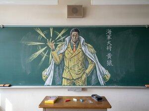 "primary_subject": "En stor, intrikat kritttegning av Kizaru (Borsalino) fra 'One Piece' på en vanlig grønn tavle i klasserommet.",