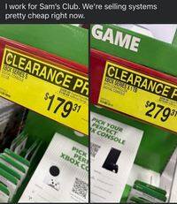 Salg av Xbox-konsoller på Sam's Club. Prisene varierer avhengig av region/sted. Xbox S $179,31–$239,31 Xbox Series X $ 279.31