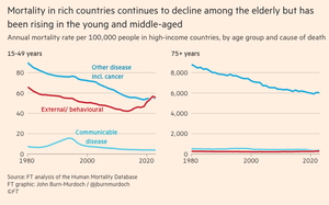 Selv om dødeligheten fortsetter å synke for eldre mennesker, har dødsfall blant yngre og middelaldrende voksne økt i mange land, spesielt USA, Canada og Storbritannia, sier John Burn-Murdoch