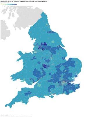 Fruktbarhetsrate for England og Wales etter kommunedistrikt i 2024. (1/3)