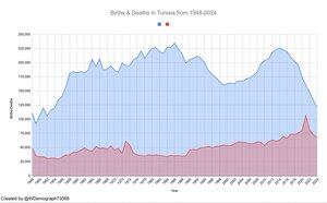 Fødsler og dødsfall i Tunisia fra 1948 til 2024. Fødsler begynte å synke i masse rundt 2014, noe som er på linje med andre ikke-vestlige land. For dødsfallene skyldes den synlige toppen Covid. (1/2)