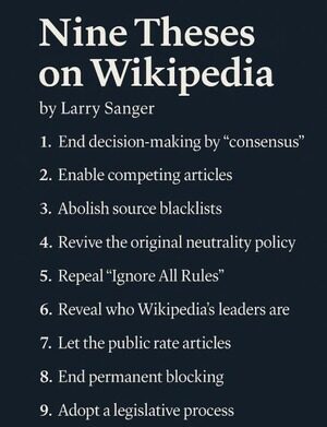 Jeg spikrer ni teser på døren til @Wikipedia. Dette har vært mitt prosjekt de siste ni månedene. Det har aldri vært et gjennomgående Wikipedia-reformforslag - dette er det første. Hvis det ikke fungerer, må vi organisere et alternativ. 🧵