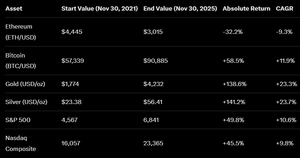 Vi har hørt om $ETH overprestasjon i årevis, data sier at Ethereum kun presterer på nedsiden Matte lyver ikke, folk gjør det (de siste 4 årene visualisert nedenfor)