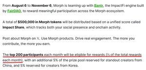 Fra 6. august til 6.november 2025 samarbeider @MorphLayer med @Bantr_fun, ImpactFi-motoren fra FairDAO, for å belønne meningsfull deltakelse med $500K i Morph-tokens.