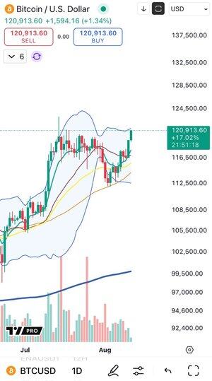 $BTC 121k og trykk på øvre BB daglig