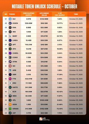 🚨 Store tokens låses opp i oktober 2025 Oktober er fullpakket med tunge opplåsinger på tvers av store navn: 🔓 $SUI - $ 142.98 millioner (1. oktober) 🔓 $EIGEN – 58.18 millioner dollar (13.77 % forsyning, 1. oktober) 🔓 $LINEA – 28,32 millioner dollar (6,57 %, 10. oktober) 🔓 $ATH – 67.81 millioner dollar (16.08 %, 12. oktober) 🔓 $ARB – 38.50 millioner dollar (16. oktober) 🔓 $GRASS – 152,42 millioner dollar (⚠️ 72,40 %, 28. oktober) 👉 Stor utvanningsrisiko for $BABY (24,7 %), $SIGN (21,5 %), $SCR (43,4 %) eller det nylig noterte tokenet på Binance HODLer Airdrops-programmet $XPL Traders bør holde øye med volatilitetstopper rundt disse datoene📅