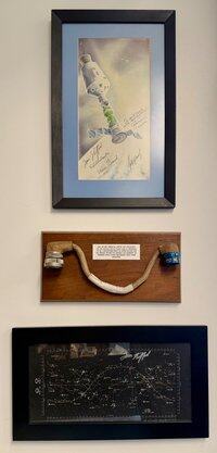 F͟i͟n͟a͟l͟ ͟O͟r͟b͟i͟t͟ lander neste uke 📕 💫 Det er den beste Hadfield-boken til nå, IMHO. Han gjør en fantastisk jobb med å integrere personlig erfaring med omfattende historisk forskning. Som en del av det gravde vi i mine amerikanske og russiske skriftlige arkiver og de fysiske gjenstandene som vises her. Uten å gi handlingen, her er noen av de heroiske gjenstandene som spiller en birolle: 1) Command Module Hatch — en flyreserve fra et av de senere kansellerte oppdragene. Svært sjelden; Kanskje bare to eksisterer utenfor det fløyne romfartøyet. Og jeg ble fortalt at det ikke er noen god video av operasjonen deres. Så jeg tok en for å demonstrere å låse opp: 2) Crewman Optical Alignment Sight – en analog head-up-skjerm som er avgjørende for dokkingjustering. Denne tilbrakte tre dager på månen for Apollo 16, detaljer: 3) Kommandomodul til dokkingmodul navlestreng som ble brukt på Apollo Soyuz Test Project, den symbolske dokkingen som markerte slutten på romkappløpet. Med det fløyne stjernekartet og underskriverne ser vi noen nøkkelkarakterer i dramaet som kommer. Mer: Bestill forhåndsbestilling: