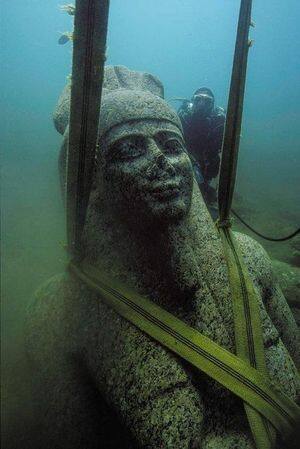 En enorm statue av guden lykkelig som en gang dekorerte et tempel i den gamle byen Heracleion.