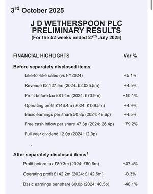 #JDW med en solid resultatoppdatering i morges 🍻 NI-bidragsøkning vil ramme neste sett med resultater, men Wetherspoon er i en posisjon til å håndtere dette deretter. Et flott sitat fra administrerende direktør Tim Martin: «Wetherspoon genererte omtrent £1 av hver £1,000 av alle britiske skatteinntekter. Med andre ord, landet trenger bare rundt tusen selskaper som Wetherspoon, og ingen andre trenger å betale skatt i det hele tatt.»