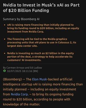 xAI samler inn 20 milliarder dollar (7,5 milliarder dollar egenkapital, 12,5 milliarder dollar gjeld) via et spesialkjøretøy for å kjøpe Nvidia GPUer til Memphis Colossus 2-datasenteret. Nvidia investerer opptil 2 milliarder dollar i egenkapital. SPV vil leie ut brikker i 5 år, med gjeld støttet av GPUer i stedet for selskapet. Valor Capital leder egenkapitalen; Apollo og Diameter deltar i gjeld.