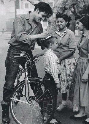 Elvis signerer autografer på hodet til en gutt i 1959.