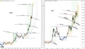 Gull og Bitcoin beveger seg ekstremt tett sammen.