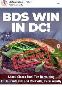 Palestinske aktivister trakasserte en israelsk restaurant i DC til å stenge. Det er nå bare 1 israelsk restaurant igjen i DC.
